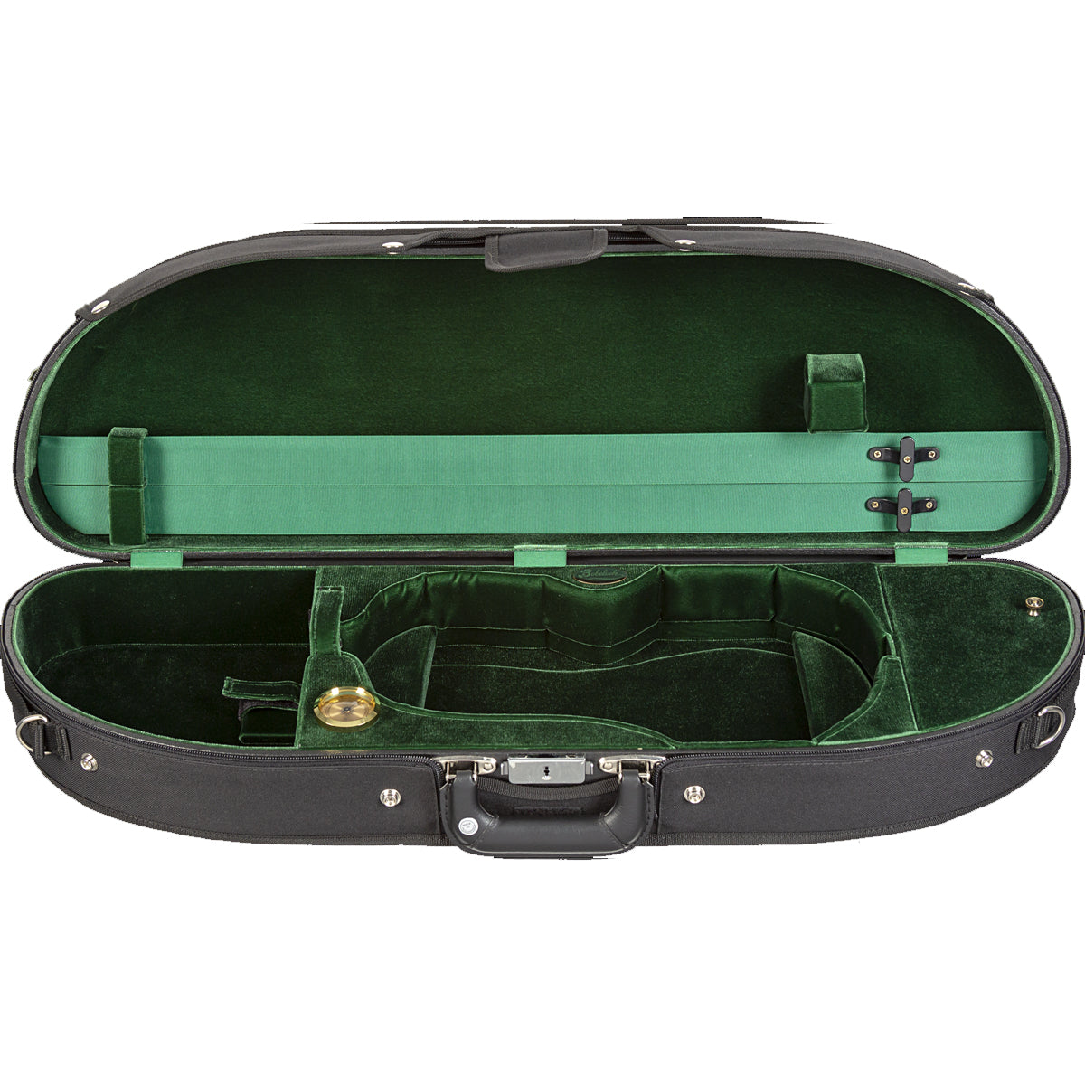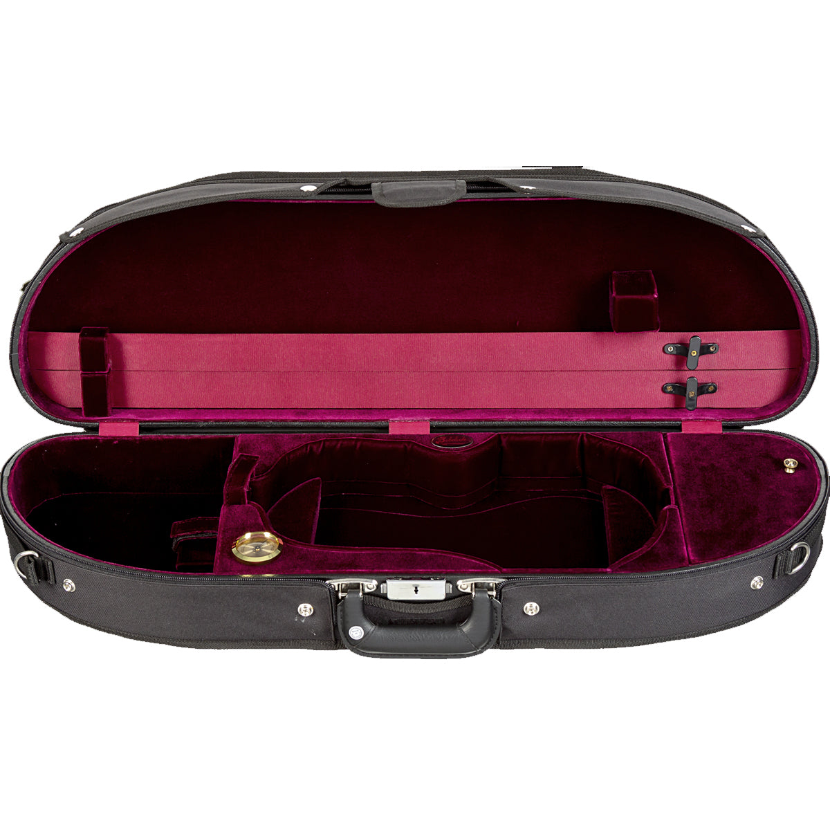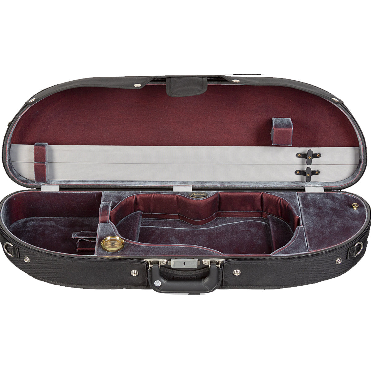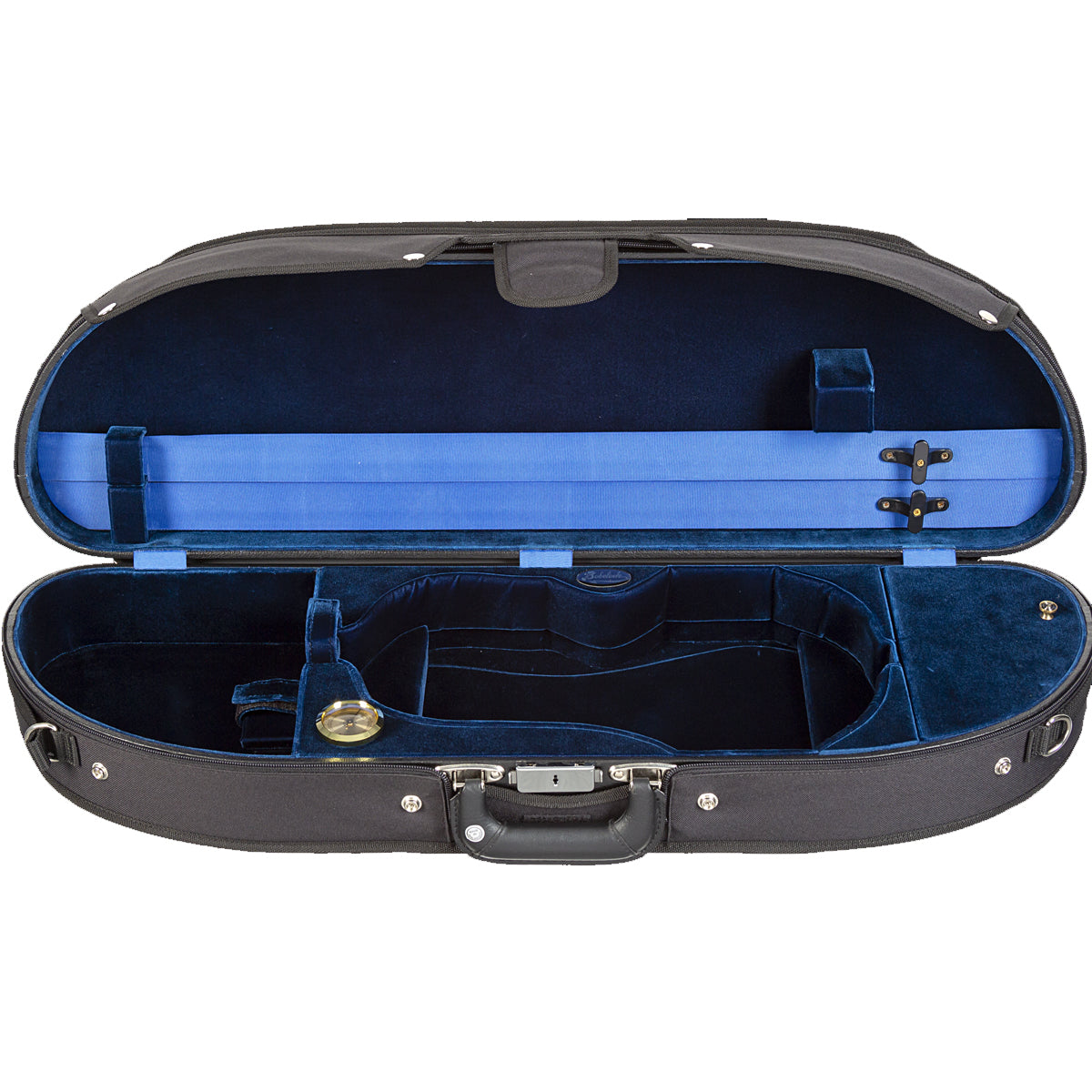 The half-moon shape of this case makes it light, easy to handle, and less expensive than oblong models. There is ample room in the large inner pocket for rosin and accessories, a strap under the neck to hold the shoulder rest in place, and a large music pocket.