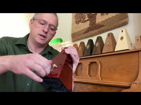 A beautiful, precision, pyramid-style, wooden metronome from Wittner. Solid wood exterior (not veneer or laminate) with cherry stain. Bell can be set to chime every 2, 3, 4, or 6 beats, or can be turned off. An extraordinarily handsome and reliable machine. A gorgeous addition to any music studio.